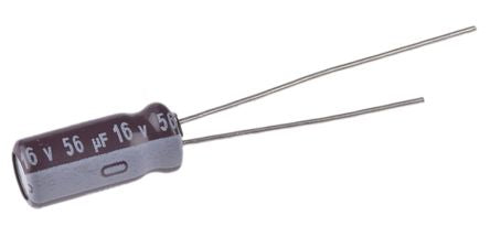 Nichicon 56μF 16V dc Aluminium Electrolytic Capacitor, Through Hole 5 (Dia.) x 11mm +105°C 5mm 2mm [UPW1C560MDD]; 715-2537
