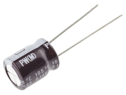 Nichicon 100μF 63V dc Aluminium Electrolytic Capacitor, Through Hole 10 (Dia.) x 12.5mm +105°C 10mm 5mm [UPW1J101MPD]; 167-7807