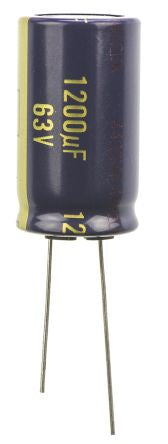 Panasonic 1200μF 63V dc Aluminium Electrolytic Capacitor, Through Hole 18 (Dia.) x 31.5mm +105°C 18mm 7.5mm [EEUFC1J122]; 108-4031