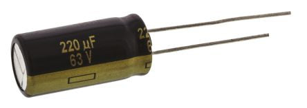 Panasonic 220μF 63V dc Aluminium Electrolytic Capacitor, Through Hole 10 (Dia.) x 20mm +105°C 10mm 5mm [EEUFC1J221X]; 628-3841