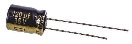 Panasonic 120μF 35V dc Aluminium Electrolytic Capacitor, Through Hole 8 (Dia.) x 11.5mm +105°C 8mm 3.5mm [EEUFC1V121]; 572-259