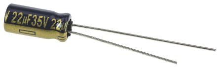 Panasonic 22μF 35V dc Aluminium Electrolytic Capacitor, Through Hole 5 (Dia.) x 11mm +105°C 5mm 2mm [EEUFC1V220]; 571-975