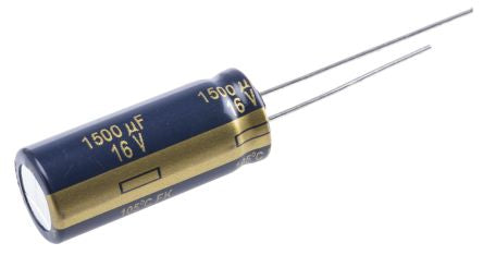 Panasonic 1500μF 16V dc Aluminium Electrolytic Capacitor, Through Hole 10 (Dia.) x 25mm +105°C 10mm 5mm [EEUFK1C152L]; 919-3542
