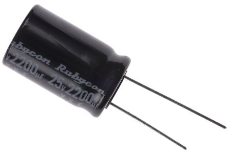 Rubycon 2200μF 25V dc Aluminium Electrolytic Capacitor, Through Hole 16 (Dia.) x 25mm +105°C 16mm 7.5mm [25YXF2200M16X25]; 191-7791
