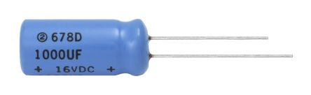 Vishay 1000μF 16V dc Aluminium Electrolytic Capacitor, Through Hole 12.5 x 26.5mm +105°C 12.5mm 5mm [678D108M016DM3DE3]; 855-6277