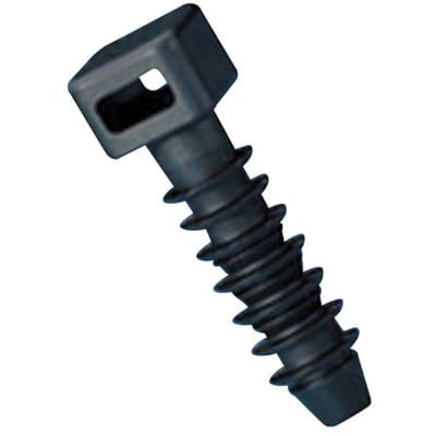 The masonry push barb cable tie mount in black, made of impact modified, weather-resistant nylon 6.6 uses a fir tree hole mounting method. It requires a hole diameter of 0.31" (7.9 mm) and is designed for use in indoor and outdoor environments. It is used