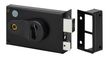 Dom Metalux Steel Black Rim Lock, Key to unlock [9772 - FE97722070]; 212-3854