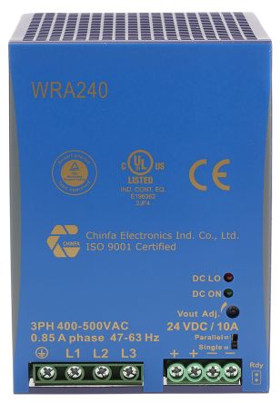 Chinfa, WRA 240 DIN Rail Power Supply, 24V dc Output Voltage, 10A Output Current [WRA240-24]; 816-3910