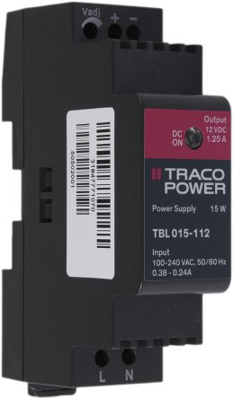 TRACOPOWER, TBL DIN Rail Panel Mount Power Supply, 12V dc Output Voltage, 1.25A Output Current [TBL 015-112]; 667-0841