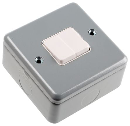 Silver 10 A Surface Mount Rocker Light Switch Aluminium 8 mm, 2 Way Screwed Semi Gloss, 2 Gang BS Standard, 250 V ac [K3592 ALM]; 246-9619