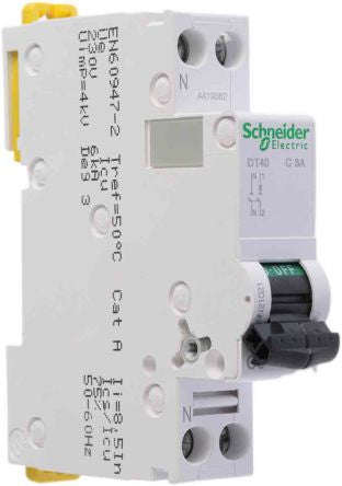 Schneider Electric Acti 9 DT40 MCB Mini Circuit Breaker, 1 + N, 3 A, 4.5 kA, Curve C [A9N21021]; 734-9598
