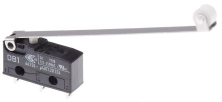 SPDT-NO/NC Long Roller Lever Microswitch, 6 A @ 250 V ac [DB1C-A1RD]; 517-757
