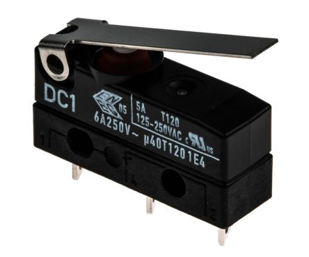 SPDT-NO/NC Hinge Lever Microswitch, 6 A @ 250 V ac [DC1C-A1LC]; 150-619