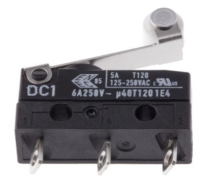 SPDT-NO/NC Short Roller Lever Microswitch, 6 A @ 250 V ac [DC1C-A1RB]; 517-674