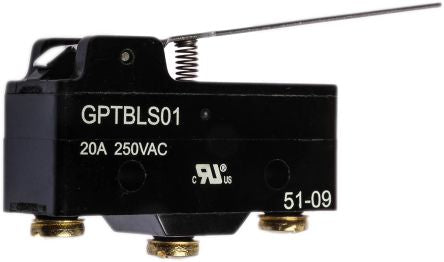 SPDT-NO/NC Long Hinge Lever Microswitch, 20 A @ 250 V ac [GPTBLS01]; 517-618