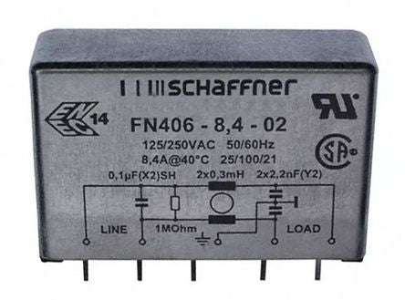 Schaffner FN406 Series 8.4A 250 V ac DC to 400Hz RFI Filter, with PC Pin Terminals, Single Phase [FN406-8.4-02]; 883-8014