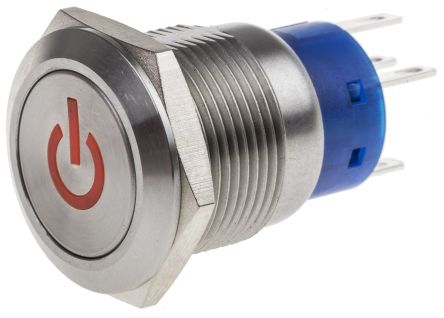 Single Pole Double Throw (SPDT) Latching Push Button Switch, IP67, 19mm, Panel Mount, Power Symbol, 250V ac; 111-3902