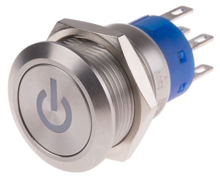 Double Pole Double Throw (DPDT) Latching Push Button Switch, IP67, 19mm, Panel Mount, Power Symbol, 250V ac; 111-5831