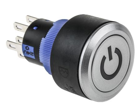 Double Pole Double Throw (DPDT) Momentary Push Button Switch, IP65, 22.2 Dia.mm, Panel Mount, Power Symbol, 250V ac; 175-8395