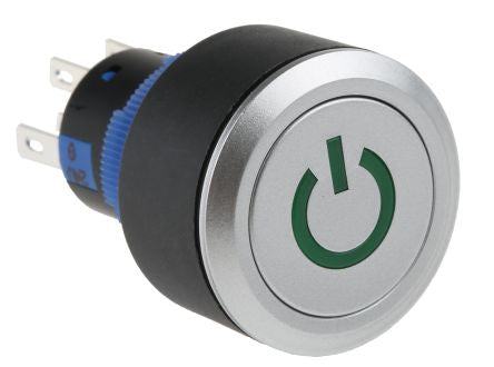 Double Pole Double Throw (DPDT) Momentary Push Button Switch, IP65, 22.2 Dia.mm, Panel Mount, Power Symbol, 250V ac; 175-8415