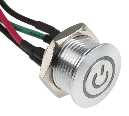 Push Button Switch, IP67, 16 Dia.mm, Panel Mount, Power Symbol, 36V dc; 175-8449