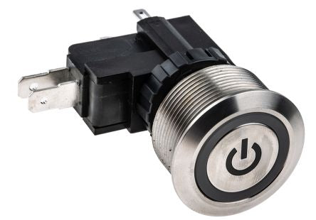 Single Pole Double Throw (SPDT) Momentary Push Button Switch, IP67, 25.2 Dia.mm, Panel Mount, Power Symbol; 175-8840