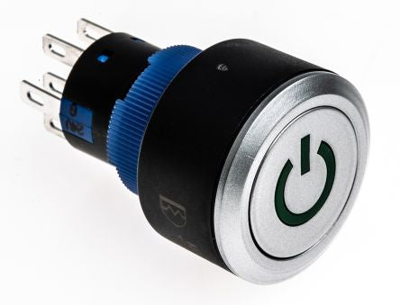 Double Pole Double Throw (DPDT) Lock Push Button Switch, IP65, 22.2 Dia.mm, Panel Mount, Power Symbol, 250V ac; 175-9009