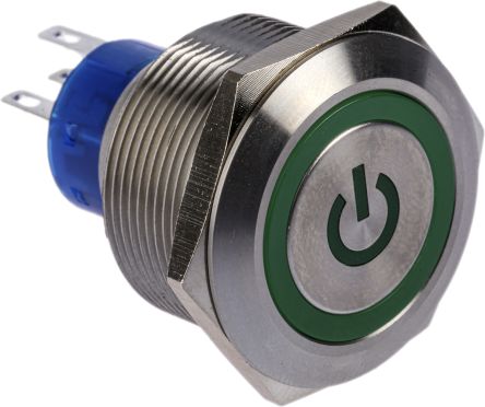 Single Pole Double Throw (SPDT) Lock Push Button Switch, IP67, 25.2 Dia.mm, Panel Mount, Power Symbol, 250V ac; 175-9047
