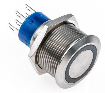 Double Pole Double Throw (DPDT) Lock Push Button Switch, IP67, 22.2 Dia.mm, Panel Mount, 250V ac; 175-9237