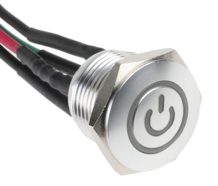 Push Button Switch, IP67, 16 Dia.mm, Panel Mount, Power Symbol, 36V dc; 175-9421