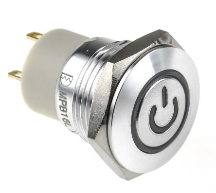 Lock Push Button Switch, IP67, 16 Dia.mm, Panel Mount, Power Symbol, 36V dc; 175-9728