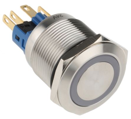 Single Pole Double Throw (SPDT) Latching Push Button Switch, IP65, IP67, 22 (Dia.)mm, Panel Mount, 24V; 811-8496