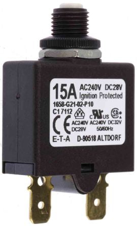 ETA 15A 1 Pole Thermal Magnetic Circuit Breaker, 28 V dc, 240 V ac 1658 [1658-G21-02-P10-15A]; 273-0882