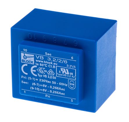 6V ac 2 Output Through Hole PCB Transformer, 3.2VA [VB 3.2/2/6]; 347-3518