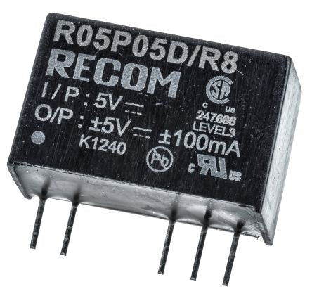 Recom 1W Isolated DC-DC Converter Through Hole, Voltage in 4.5 → 5.5 V dc, Voltage out ±5V dc [R05P05D/R8]; 733-1008