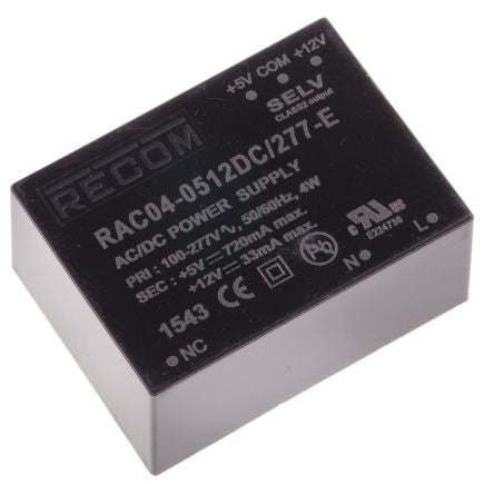 Recom, 4W Embedded Switch Mode Power Supply SMPS, 5/12V dc, Encapsulated [RAC04-0512DC/277-E]; 905-8746