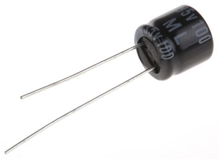 Rubycon 100μF 35V dc Aluminium Electrolytic Capacitor, Through Hole 8 (Dia.) x 7.5mm +105°C 8mm 3.5mm [35ML100MEFC8X7.5]; 704-7841