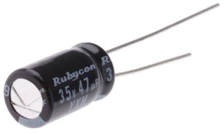 Rubycon 47μF 35V dc Aluminium Electrolytic Capacitor, Through Hole 6.3 (Dia.) x 11mm +105°C 6.3mm 2.5mm [35YXM47MEFC6.3X11]; 172-6159