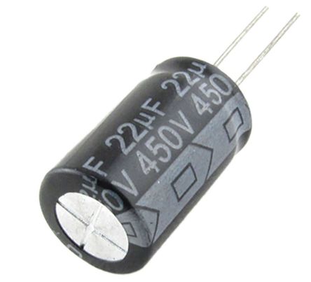 Rubycon 22μF 450V dc Aluminium Electrolytic Capacitor, Through Hole 16 (Dia.) x 20mm +105°C 16mm 7.5mm [450BXC22MEFC16X20]; 726-0735