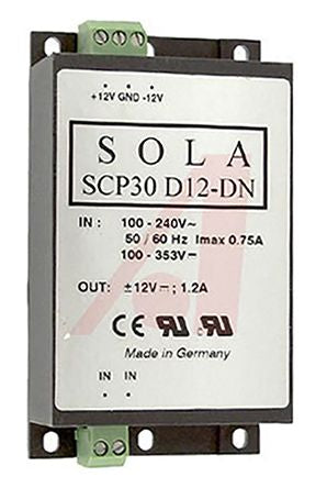 SolaHD, SCP DIN Rail Power Supply, ±12V dc Output Voltage, 1.2A Output Current [SCP30D12-DN]; 890-8915