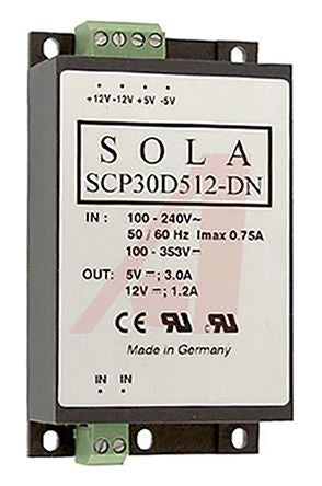 SolaHD, SCP DIN Rail Power Supply, 5 V dc, 12 V dc Output Voltage, 1.2 A, 3 A Output Current [SCP30D512-DN]; 890-8927