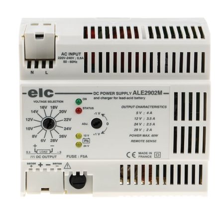 ELC ALE Switching DIN Rail Power Supply 230V ac Input, 5 V c.c., 10 V c.c., 12 V c.c., 15 V c.c., 24V dc Output, 4 A [ALE2902M]; 454-6623