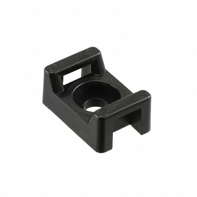 The cable tie mount in black is applied with a #8 (M4) screw and is 0.43" (10.9 mm) wide. It is made of heat-stabilized nylon 6.6, which increases mechanical strength, heat and wear resistance, and stiffness in indoor environments. It comes in packages of 1000.